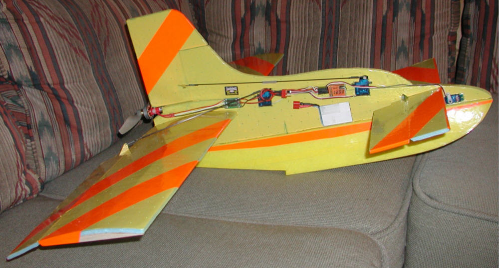 NOTE: after another flying session, I'm still not satisfied with the airfoil on the rear mounted wing, and the fact that with the single aileron servo, it's impossible to trim the wing in the air. I'm strongly inclined to rework this design using a WILD WING wing (a flying wing bwith a reflex at the trailing edge of the airfoil), using dual elevon servos, so that I will then be able to adjust the elevon reflex precisely in the air. I'll likely use a custom mix from the Elevator channel into (channel 5?) to control the canard. These modifications may make the SNOBOAT into a far more stable and predictable flyer, which will be capable of some interesting aerobatics, and give it excellent stability as well. It's a project that ought to be fun to complete! Water-proofing the servos and receiver and ESC for water flying is another issue that was not dealt with in the original SNOBOAT build, either, so this is another design aspect to be worked out.