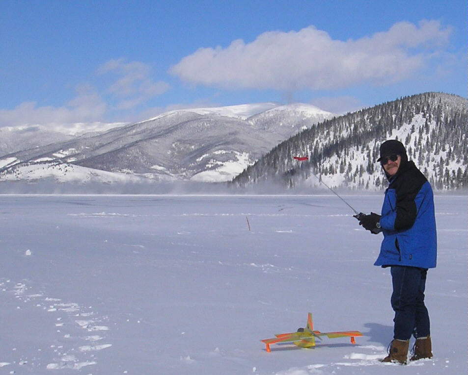 Here in the high Colorado Rockies, we have snow on the ground & lakes a lot of the year (December through April are prime snow flying months.) Many of my planes have flown their first flights from snow on skis over the years; several others were designed for float flying, and stay on floats all year, waiting for open water in early May. (At 10,000 feet, spring does not arrive too early...)