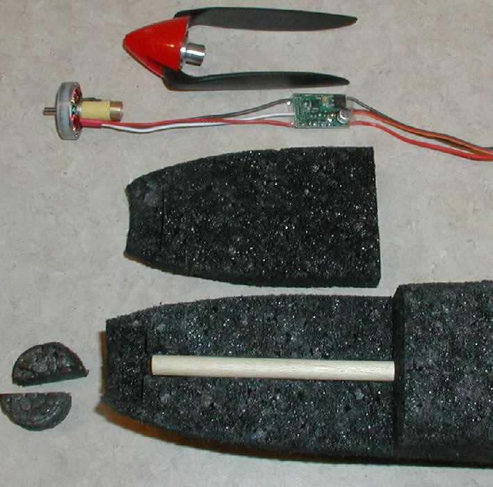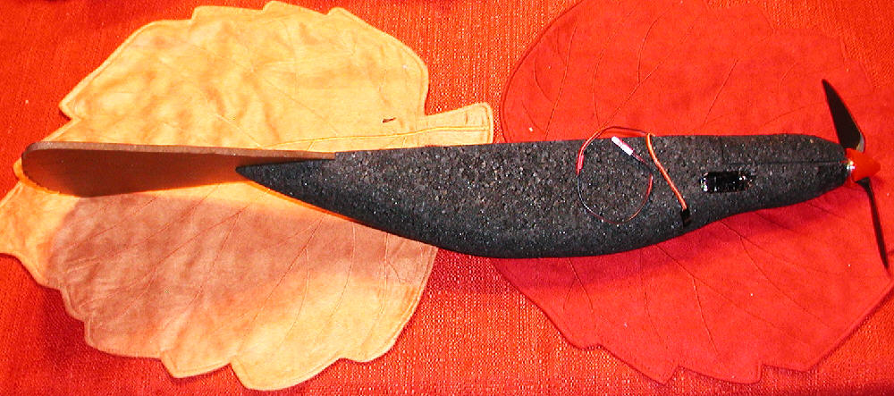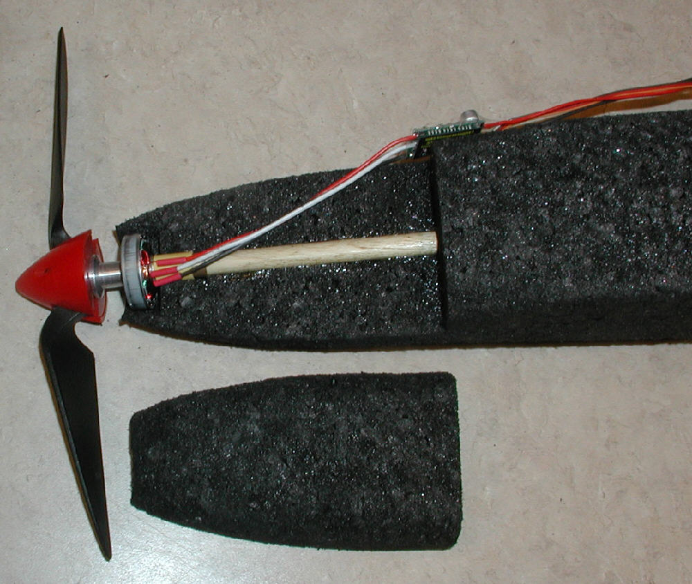 The solid EPP foam body is made from a block of 1.3# density foam that is 2-3/8" wide, 2-3/4" high, and 18-5/8" long, shaped by band-sawing & then carving with a sharp fillet knife before sanding, to end up looking somewhat like a bird's body. After shaping, & with the motor mount shaft and wing mount plates epoxied in place, the body weight only 1.0 ounce. (The tail group, assembled, glued, & painted, weighs 1/2 ounce.)