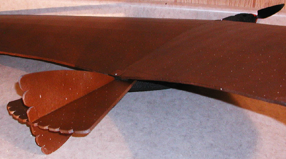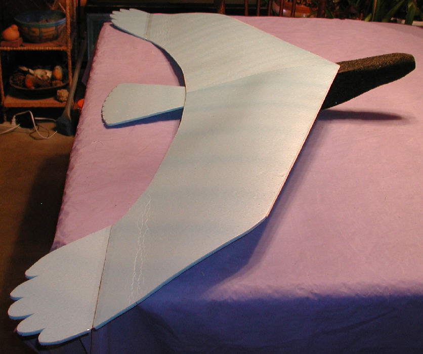 [Above] The tail is painted with Mocha Brown Rustoleum "Fabric Paint" (bought at Lowes); it's a new foam-safe, flat finish paint. Wing will also get a base coat of this paint.