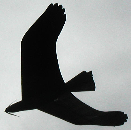 Four ravens cruised by to check out the new bird in the neighborhood, and while I think they were trading derisive remarks among themselves about SOARBIRD's flying style, they did not crowd him too closely.