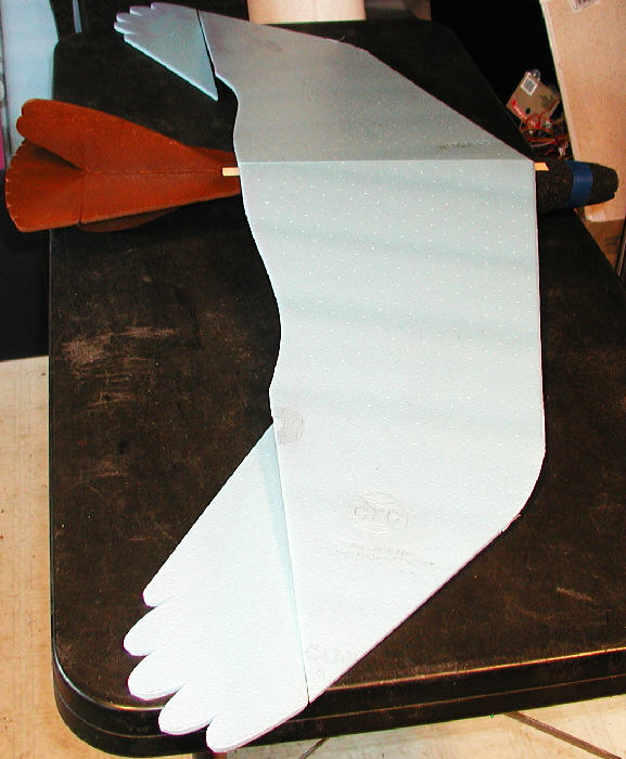 SOARBIRD has a new wing designed & cut out, ready for assembly. I've reduced the span to fit each half across the narrower dimension of a sheet of Fan Fold Foam, (I'm using double faced BlueCor), so two sets of wings can be cut from a single sheet of this material. In dodging the folds, the wingspan ends up at about 47".