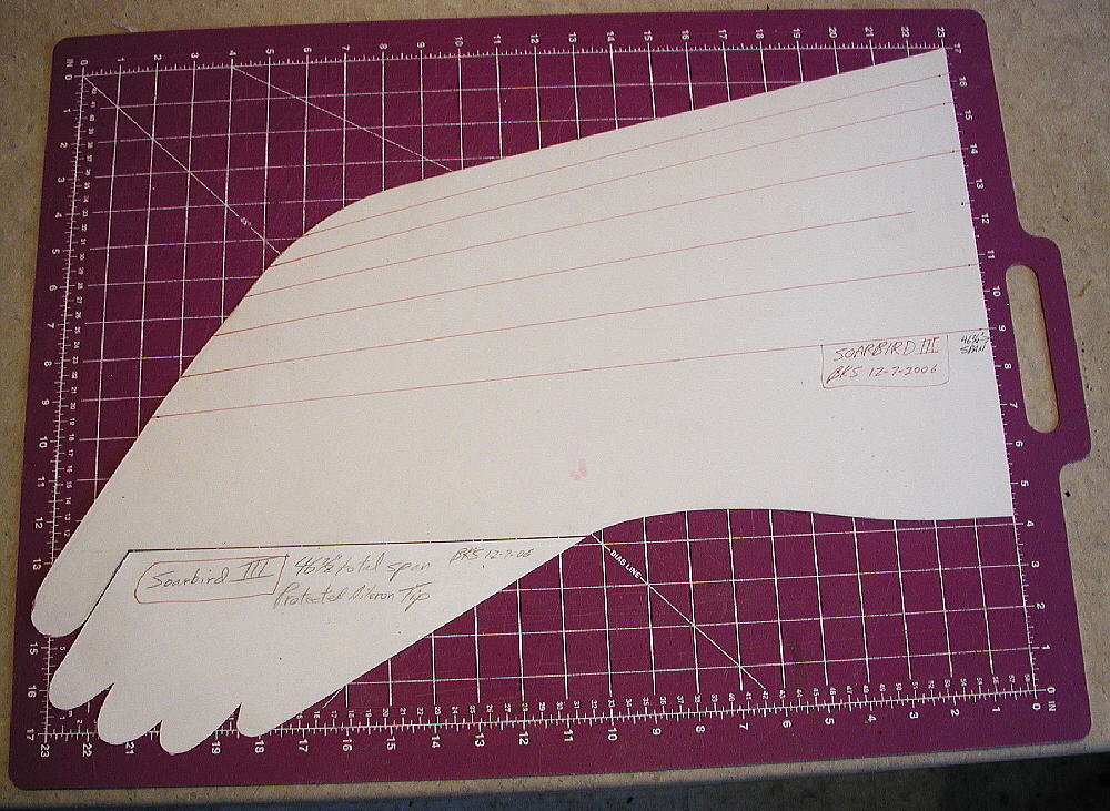 Here's two new photos; the lower one is of the wing tip modification I did to the 53" span wing on SOARBIRD II. The cutting template for the new 47" wing is also shown (above) on a 1" grid cutting mat background for scale.
