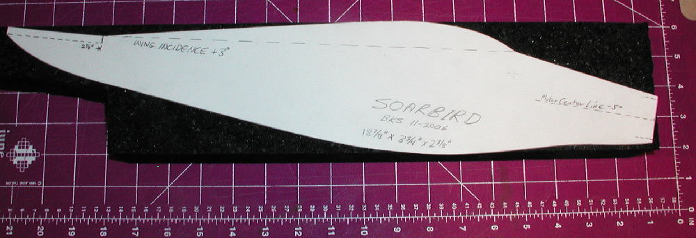 [Nov. 22nd, 2006] The undercambered Bluecor wing requires some positive wing incidence, relative to the tail / horizontal stabilizer, to fly with less aileron reflex (for a cleaner, more efficient glide.) I shimmed the wing's leading edge up about 9/16" ; than might come out to about 2 degrees of positive incidence, typical for Jedesky type airfoils. I still am flying with some up elevator trim... the ideal / most efficient setup would have SOARBIRD flying with zero up elevator trim....