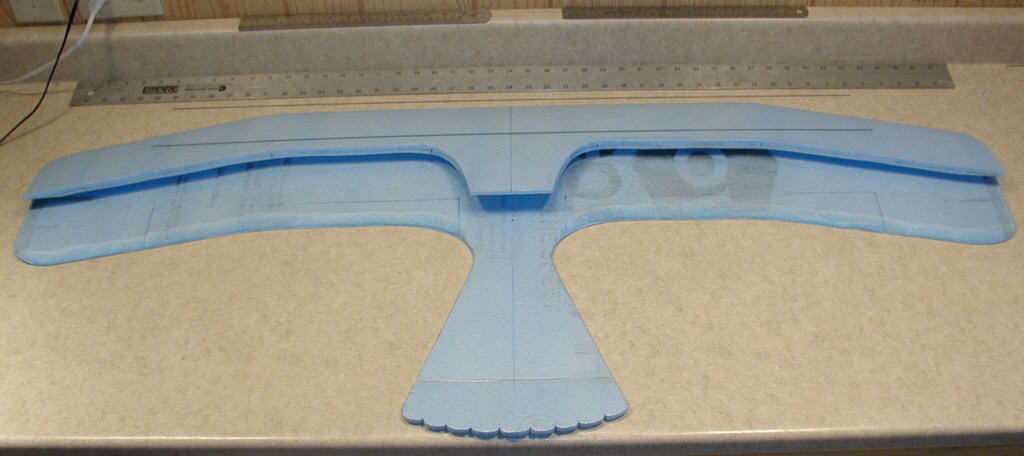 [Above] Body top view shows two light colored wing mount ply plates, 1/6" " birch ply, inset flush with the foam's surface. The tail is also inset to be flush with the wing mounting surface. There are EPP fillers glued to the underside of the wing.
