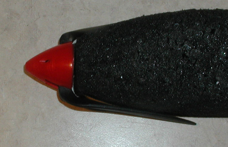 [Above] Upper half of nose, back 4-3/8", is cut away; 5/16" dowel for motor mount is epoxied in place