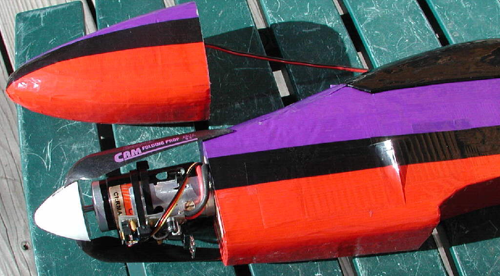 For flying with the 05 Cobalt motor, the sloper nose comes off, and the motor mount attaches quickly to the firewall with 4 screws. (I'm now using a Dave Brown 2025L motor mount, which weighs about 1 ounce.) Performance with this motor / battery setup is quite impressive at the 48-3/8 ounce flying weight.