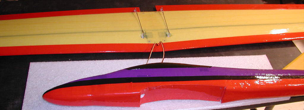 The 4 cell 1500 NiCad (A sized cells) Panasonic receiver pack in the sloper nose contributes some substantial weight, just where it's needed, well forward in this nose section. There's presently 4-1/8 ounces of balancing weight, in the form of ten sheets of 1/16" thick lead, in a compartment just behind the battery in this sloper nose. Flying weight (sloper configuration) is at a minimum of 32 ounces- a good weight for slope soaring with this size aircraft in light winds, giving it a wing loading of 8-1/3 Ounces per square foot for this 3.85 square foot wing. Ballast weight for flying heavier winds is quickly and easily velcroed in place under the canopy in the battery carrrying compartment (which is located over the CG for easy balance adjustment.)