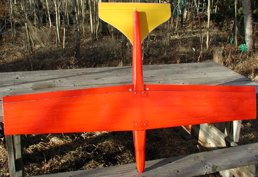 The wing on this one is detachable, mounted to the fuselage with 4 #8 pan head sheet metal screws running through 1/32" ply plates & balsa filler blocks in the wing, which then fasten into 1/8" birch ply plates that are epoxied into the EPP foam. Nylon filament tape wraps the fuselage to complete the securing of the wing mount plates. (In building my own EPP aircraft, I prefer to work with epoxy, which outgasses less volatiles, as I am personally sensitive to solvent based glues; others use GOOP and a variety of other adhesives.)