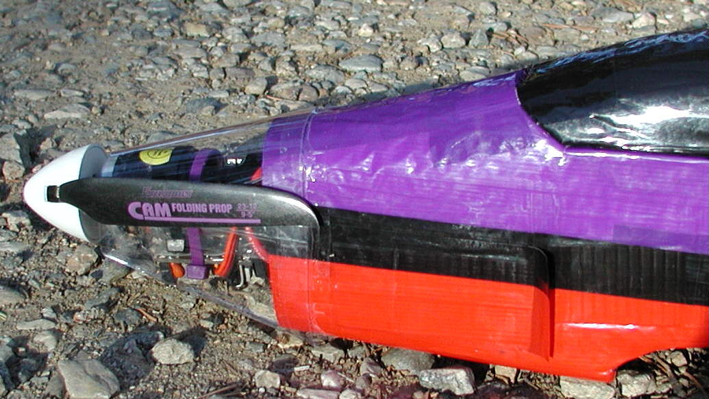 The black EPP foam cockpit canopy hinges forward, giving access to the place for the 7 cell battery, or for ballast weight when slope flying. (The canopy is vented to offer a bit of battery cooling when flying powered aerobatics; the rear end simply tapes down in place.)